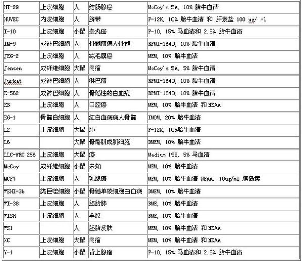 培養某一類型細胞沒有固定的培養條件。在MEM中培養的細胞,很可能在DMEM或M199中同樣很容易生長。總之,首選MEM做粘附細胞培養、RPMI-1640做懸浮細胞培養,各種目的無血清培養的首選是AIM V培養基(SFM)。在開始進行新的細胞培養時,可以參考下表所列的條件: