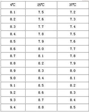 緩沖液的PH值隨溫度變化而變化。下表列出了50 mM Tris-HC 溶液在4 ℃,25 ℃,37 ℃時,不同的PH值。