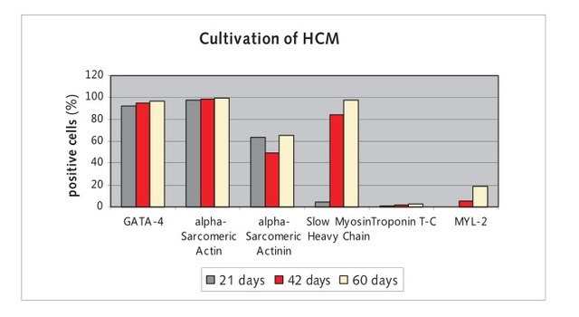 在PromoCell的HCM的長期體外培養過程中,分化階段的各個不同標記物的表達情況會有變化。隨著HCM培養時間的進一步延長,則稍晚期分化階段的一i標記物的表達呈陽性,并且有20%以上的HCM對最終分化階 段的標記物呈現陽性。
