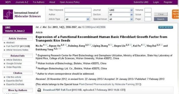 相關論文 “Expression of a Functional Recombinant Human Basic Fibroblast Growth Factor from Transgenic Rice Seeds”(利用轉基因水稻種子表達功能性重組人堿性成纖維細胞生長因子)于2013年2月7日在線發表于 《International Journal of Molecular Sciences》。