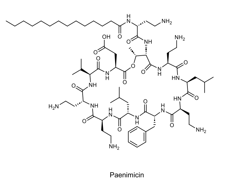 通過進一步的結構優化,包括脂質鏈,鏈長、分支度和取代度等特征,研究團隊最終獲得了具有最佳抗菌活性和穩定性的 Paenimicin——這種由 11 個氨基酸組成的環狀脂肽,其獨特的結構特征為其抗菌性能奠定了分子基礎。